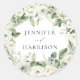 Scellez vos enveloppes de faire-part de mariage ou vos faveurs avec nos élégants autocollants de mariage fleuris portant vos noms encerclés par une couronne de fleurs de gardenia blanches peintes, des sprigs de la respiration du bébé, des dahlias, des feuilles de fougères vert sauge et des feuilles verts vibrants. Conçu pour coordonner avec notre collection Lush White Flowers and Greenery.
