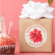 Autocollants ronds personnalisés pour les fêtes de Noël présentant une élégante poinsettia rouge avec votre nom et vos vœux en lettrage chic sur des bandes ivoire. Tout le texte, les polices, les couleurs des polices peuvent être modifiés, il suffit de cliquer sur le lien "personnaliser davantage".