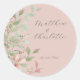 Sticker rond rose Mariage classique aux fleurs de printemps. Ce Sticker Mariage est conçu avec des grappes de Feuilles Aquarelle dans des tons doux de vert et de rose sur un arrière - plan rose assorti. Le texte comprend : Les prénoms et la date du Mariage de la mariée et de la mariée. Pour personnaliser, insérez simplement vos détails dans notre modèle, en remplaçant l'exemple de texte. Assurez-vous de consulter la collection complète de Mariages d'aquarelle rose fleur de printemps pour les cartes et accessoires correspondants.
