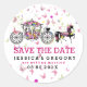 Elégant cheval de mariage et chariot avec des fleurs colorées et des papillons illustration, Enregistrer la date personnalisable autocollant. Couleur arrière - plan blanche personnalisable.