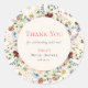 Ceci est un autocollant de remerciement rond élégant et estival. Le design présente une auréole colorée et estivale de florales de fleurs sauvages délicates dans de jolies nuances de bleu, de terre cuite, de rose, de rouille, de violet et de jaune. Les papillons et les abeilles ajoutent la touche finale fantaisiste et jolie.