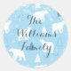 Autocollants ronds classiques personnalisés représentant des ours polaires mignons avec des flocons de neige qui tombent sur un fond bleu glace avec le nom de famille dans une police de caractères script grise bleutée. Parfait pour les sceaux d'enveloppe et les étiquettes de cadeau. Conçu par Thisisnotme©
