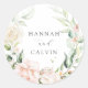 Scellez vos enveloppes d'invitation ou vos faveurs avec ces élégants autocollants de mariage. Doté de vos noms encadrés par une couronne d'aquarelle de feuillage vert d'eucalyptus et de fleurs rousses. Coordonnée avec la collection de mariages Blush and Greenery que l'on trouve dans la boutique Adore Paper Co. Zazzle Shop.