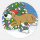 Cet adorable chien de dessin animé brun & blanc fait un grand bond sur une branche d'arbre de Noël. Il porte un casquette Père Noël rouge et porte un ornement jaune rond dans sa bouche. L'arrière - plan est bleu avec la neige qui tombe. Un cadeau unique de flyball de Noël pour les propriétaires d'animaux de compagnie. En bas, on peut lire : "Dashing through the snow..."