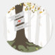Un autocollant de mariage de automne extérieur avec l'illustration d'un arbre dans la forêt. L'arbre a des feuilles d'automne, des racines exposées, et un tronc enveloppé d'une bannière qui peut être customisé avec les noms de mariée et mariée.