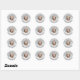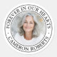 Round sticker featuring a photo and custom text "forever in our hearts" and name in an elegant serif font on a white background.