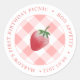 Aquarelle fraise contre un arrière - plan en vichy rose et blanc. La fraise était à l'origine peinte à la main par moi dans du papier 100% coton avant d'être scannée sous forme numérique. Montré ici comme un autocollant à placer sur les boîtes de bienvenue pique-nique, mais bien sûr tout le texte est personnalisable à vos besoins. VEUILLEZ NOTER que le texte autour de l'arête doit être exactement la même longueur que l'échantillon pour la courbe correctement. Vous pouvez modifier la couleur de contraste du en vichy (actuellement un rose doux) en changeant la couleur arrière - plan de l'autocollant.
