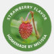 Étiquette vos gâteries maison avec cet autocollant vibrant avec une photo de fond de Destei d'une fraise sauvage rouge, encadrée par une bordure verte. Le design inclut le texte "Saveur de fraise" en haut et "Fabriqué maison par [Nom]" en bas, ce qui le rend parfait pour les jarres à confiture, les produits de boulangerie ou l'emballage de cuisine. Un look frais et naturel qui ajoute une touche personnelle et polie à vos créations sur le thème de la fraise.