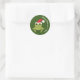 Des autocollants de Noël amusants montrant une grenouille souriante dans un chapeau de Père Noël sur un arrière - plan vert. Ces stickers mignons ont les mots "Joyeux Noël" et une année personnalisable. Frog Père Noël Joyeux Noël Classic Round Sticker Jour férié Design | ©Melissa Patton - Artiste/Illustrateur