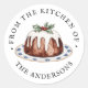 Cute custom round sticker featuring a watercolor illustration of a Christmas pudding and the text "From the Kitchen of" plus any text you like, like your family name. This sticker is the perfect addition to baked goods and holiday bakery - whether you're a professional baker or someone who loves to bake for family and friends. Use this watercolor Christmas pudding sticker to label your homemade goodies or as a gift tag for your baked treats. With its charming design, this sticker is sure to add a special touch to any delicious good you create.
