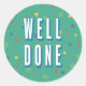 Fun pattern Done The well done objets the words "WELL DONE" in a big and bold 3D printed font on top of a fun scattered pattern of pink triangles, purple circles, blue spirals and pink squiggles all on green background.