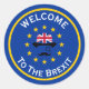 Soutenez votre réfugié britannique local, le brefugee, avec cet autocollant rond. L'arrière - plan est bleu du drapeau de l'UE. Les réfugiés britanniques, connus sous le nom de réfugiés, peuvent avoir leur propre Brexit. Ils sont les bienvenus dans l'Union européenne. Protégez vos droits de l'homme et rejoignez-nous dans l'UE. Bienvenue au Brexit, Monsieur ! Un casquette britannique avec un Union Jack sur un champ du drapeau de l'Union Européenne. Les étoiles et l'arrière - plan bleu sont officiels de l'UE. Le casquette bowler est complété par un monocle et une moustache.