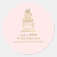 Un autocollant d'emballage propre, professionnel et moderne pour les créateurs de gâteaux et les stylistes de bar à desserts. Ce design présente une image fantaisiste dessinée à la main d'un gâteau à trois étages en or faux et des détails professionnels en or faux, sur un fond rose blush.