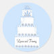 Un élégant gâteau à quatre étages en mariage blanc aux accents bleus doux. Une jolie teinte de bleu pour l'arrière - plan. Customisez en ajoutant les noms des mariés et des mariés comme vous le souhaitez.