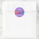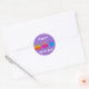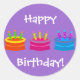 Cet autocollant présente un design avec trois gâteaux d'anniversaire colorés, qui ont chacun trois étoiles bougies couvertes. Le texte "Joyeux Anniversaire", et arrière - plan violet, peut être customisé comme souhaité.