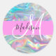 Nom monogramme irisé holographique de l'arc-en-ciel et autocollant rond classique initial. Votre nom personnalisé et votre monogramme sont écrits dans un élégant script écrit à la main avec un arrière - plan rose. Un cadeau d'anniversaire ou de Noël parfait !