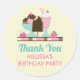 Un autocollant de remerciement de fête avec un thème de crème glacée sucrée. Illustré avec un bar à crème glacée au chocolat, un sundae à 3 boulettes avec une cerise sur le dessus, et un flotteur de fraise. Petites fraises et cerises sur le fond. Couleurs roses et marron.