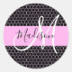 Glam et girly noir et rose nid métallique abeille motif nom monogramme et autocollant rond classique initial. Votre nom personnalisé et votre monogramme sont écrits dans un élégant script en lettres blanches et noires avec un arrière - plan rose. Vous pouvez modifier la couleur du texte, le style et la taille de police à l'aide de l'option personnaliser.