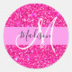 Glam et parties scintillant rose vif scintillent le nom de monogramme blanc et autocollant rond classique initial. Votre nom personnalisé et votre monogramme sont écrits dans un élégant script écrit à la main avec un arrière - plan rose. Vous pouvez modifier la couleur du texte, le style et la taille de police à l'aide de l'option personnaliser. Un cadeau d'anniversaire ou de Noël parfait !