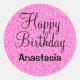 Autocollant rond personnalisé girly et glam Happy Birthday classique avec une parties scintillant rose chaud brillant arrière - plan et élégante écriture noire. Vous pouvez facilement ajouter le nom de votre choix et changer la couleur et la police du nom en utilisant l'option personnaliser !
