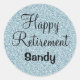 Glam personnalisé Happy Retirement classique rond autocollant avec une parties scintillant en argent bleu clair scintille l'arrière - plan et l'élégante écriture noire. Vous pouvez facilement ajouter le nom de votre choix et changer la couleur et la police du nom en utilisant l'option personnaliser !