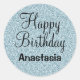 Autocollant rond classique pour anniversaire Happy avec une parties scintillant d'argent bleu clair scintille l'arrière - plan et l'élégante écriture noire. Vous pouvez facilement ajouter le nom de votre choix et changer la couleur et la police du nom en utilisant l'option personnaliser !