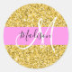 Glam et girly rose et jaune or parties scintillant scintille le nom de monogramme blanc et l'autocollant rond classique initial. Votre nom personnalisé et votre monogramme sont écrits dans un élégant script écrit à la main avec un arrière - plan rose. Vous pouvez modifier la couleur du texte, le style et la taille de police à l'aide de l'option personnaliser. Un cadeau d'anniversaire ou de Noël parfait !