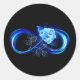 Luminous infinity symbol with glowing, beautiful, lushly blooming rose made of blue flames on black background.