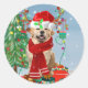 Sticker Rond Golden Retriever Dog en neige avec cadeaux de Noël