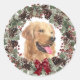 Sticker Rond Golden Retriever Red Bow Pinecone Wreath Noël