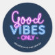 Sticker Rond Classique Classique Personnalisé Et Branché À Good Vibes Uniquement En Néon. Design amusant et positif avec un néon signe avec le dicton "Good Vibes Only". Très style rétro années 80. Le texte ci-dessous est personnalisable. Supprimez le texte si vous ne voulez pas d'une version customisée.