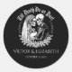 Celebrate a love that lasts beyond a lifetime with this unique "Till Death Do Us Part" design. Featuring a beautifully illustrated vintage-style skeleton bride and groom in a romantic embrace, this sticker is perfect for your gothic or Halloween themed wedding. Easily personalize it with your names and special date to create unforgettable wedding favors, envelope seals, or decorations for your big day. This design is ideal for the alternative couple looking to add a touch of dark romance to their celebration.