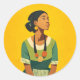 Portrait stylisé d'une femme au teint foncé, orné de bijoux circulaires audacieux et d'une robe verte vibrante. L'arrière - plan jaune minimaliste renforce son expression sereine et confiante, mêlant art moderne et élégance afrocentrique.