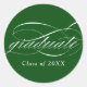 Green Modern Elegant Script Graduation Classic Round Sticker dispose d'un script magnifique et élégant, ainsi que votre année de classe.