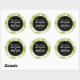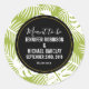 Un autocollant avec vos informations de date mariage avec un motif répétitif de grands feuilles de palmiers sur un arrière - plan vert olive. Moderne tendance et tropical. Un cercle noir avec une bordure intérieure dorée superposée avec vos détails personnalisés à l'intérieur.