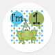 Les amateurs de grenouilles aimeront ce joli design 1er anniversaire de la Grenouille Bleue avec la grenouille verte portant un casquette de fête, des pois et ballons bleus et verts, et le texte qui dit "I'm 1".