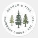 Les autocollants rustiques chic pour votre extérieur, aventure, ou entreprise orientée nature disposent d'un trio de pins verts chasseurs avec deux champs de texte personnalisés dans un design circulaire incurvé.