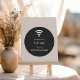 A Wi-Fi symbol. Add your wi-fi name and password for your customers/guests. Black background, white text.