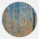 Il s'agit d'oeuvres de Gustav Klimt, Beech Grove 1, 1902. Les oeuvres d'art dépeignent une forêt dense de grands bouleaux, minces, aux troncs pâles marqués par des lignes verticales foncées. Le feuillage est dépeint dans les tons bleu, vert et jaune, ajoutant un sens de profondeur et de vibrations à la scène. Le sol de la forêt est recouvert d'une couche de feuilles orange et marron, créant un contraste saisissant avec les tronçons d'arbres plus légers. La composition globale utilise des techniques pointillistes et impressionnistes, donnant à l'image une apparence vivante et texturée. La verticalité des arbres souligne la structure sereine et rythmique de la forêt.
