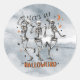 Cet autocollant est parfait pour sceller votre enveloppe d'invitations de fête d'Halloween! Trois squelettes dansent toute la nuit et il dit : "Allons-y HALLOWEIRD". Contre un arrière - plan gris nuageux.