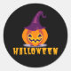 Cet autocollant rond est illustré d'un imprimé citrouille hantant Halloween. Vous pouvez Customiser cet autocollant.