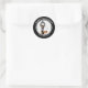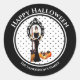 Conçu par Farida Greenfield. Illustration de mode d'une dame portant une superbe robe noire classique élégante tenant un balai sorcier décoré de rubans noirs avec des citrouilles au premier plan et un motif pois noir et blanc à l'arrière - plan. Conception parfaite avec thème Halloween. La conception a un cercle noir sur le côté extérieur et des textes qui peuvent être personnalisés sur le dessus et le bas. Il fera un joli ajout à votre décor de maison d'Halloween ou un cadeau de ménage pour une nouvelle maison.