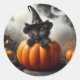 Un chaton noir portant un casquette de sorcière repose à l'intérieur d'un grand citrouille, entouré de petits citrouilles et de brume tourbillonnante