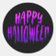 Un autocollant qui dit 'Happy Halloween' dans un texte rose et violet conçu pour ressembler à une pituite dégoulinante sur un arrière - plan noir.
