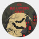 Sticker rond Halloween Rouge noir Haunted Maison Pleine lune chauve classique. Unique, beau, design élégant. Facile à personnaliser. Le style de police, la taille et les couleurs peuvent être modifiés. Des éléments correspondants sont disponibles.