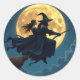 Une sorcière super cool et démoniste sur un balai devant un autocollant d'Halloween pleine lune.