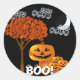 Sticker d'Halloween Avec un ciel noir, Crescent Moon, Nuages, Famille Citrouille mignonne debout à côté d'un arbre avec des Feuilles couleur chute orange et un Big BOO! Les yeux au-dessus des lettres vous invitent à une fête d'Halloween la plus éffrayante, mais pas trop. Parfait pour la fête d'Halloween de la récolte de l'église ! Sticker Halloween Sceller pour vos invitations Halloween ou pour vos sacs de traitement.