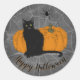 Un autocollant d'Halloween d'inspiration vintage avec deux corbeaux noirs perchés sur un citrouille rustique avec un détail cobweb ci-dessus. Contre un arrière - plan de style parchemin, ce design ajoute une touche élégante, légèrement gothique, à l'emballage d'Halloween, aux faveurs festives ou au courrier de saison.