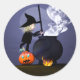 Stickers pour Halloween avec mon oeuvre d'une petite sorcière debout sur un citrouille remuant son chaudron bouillant.