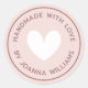Round stickers with a white heart surrounded by the text "handmade with love" and your name or other custom text on a light blush pink background. Use as stickers for gifts and favors, product packaging etc.